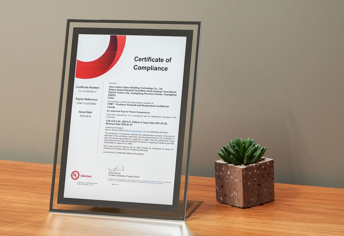HECOR has recently achieved UL/CUL 962 certification for its office privacy pods, demonstrating full compliance with electrical and material safety requirements for the North American market.